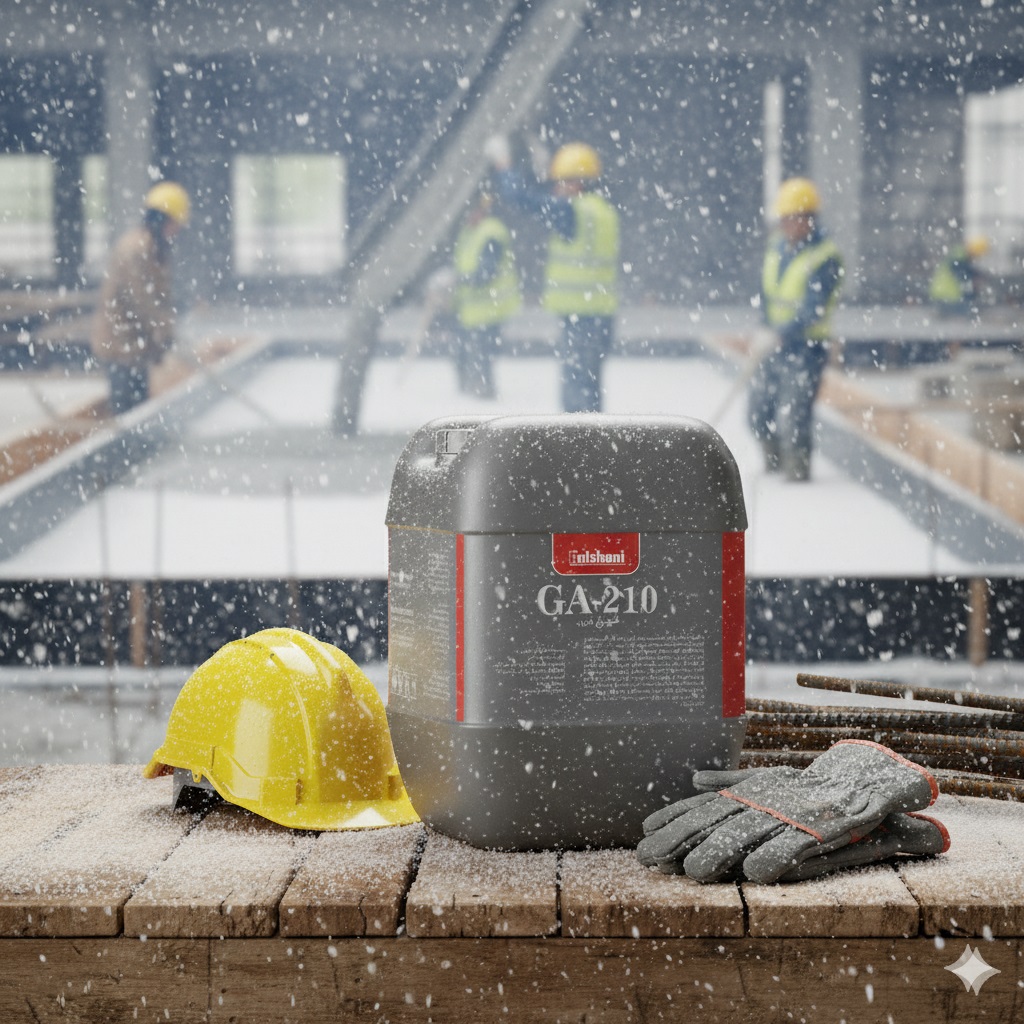 GA-211 با تسریع در روند واکنش هیدراسیون باعث افزایش دمای بتن و کسب مقاومت زود رس می شود بنابراین در برودت و سرما در هنگام بتن ریزی و ساعاتی پس از آن بتن از خطر یخ زدگی و یا متلاشی شدن حفظ می گردد. این محصول فاقد کلر بوده و پایه آن بر اساس یون نیترات می باشد. این ترکیب همچنین با پوشش بر روی آرماتور و عناصر فلزی داخل بتن از خوردگی آن جلوگیری می نماید. GA-211 می تواند در شرایط دمایی 5 تا 15- درجه در عملیات بتن ریزی موثر و مفید باشد. با این وجود توصیه می شود تمهیدات بتن ریزی در هوای سرد نظیر 1- گرم کردن آب و مصالح طرح اختلاط بتن 2- استفاده از سیمان زود گیر 3- استفاده از فوق روان کننده های زود گیر 4- پوشش مناسب و کامل مقاطع بتنی پس از بتن ریزی 5- گرم نمودن محل بتن ریزی و یا محصور و محفوظ نمودن از باد در اطراف محل بتن ریزی دیده و لحاظ شود.